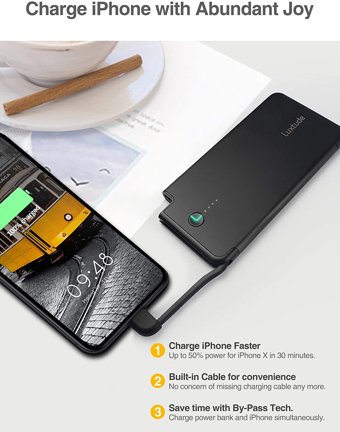 • ✔ POWER IPHONE WONDERFULLY: (1) HIGH CAPACITY. It can charge iPhones 1.1-1.8 times, great for full day travel or backup supply. (2)FAST CHARGING. Twice as fast as iPhone original wall charger & original cable. (3)CONVENIENT. With built in cable, no more missing charging cord. (4)TIME SAVING. With our by-pass tech, you can charge iPhone & power bank simultaneously.