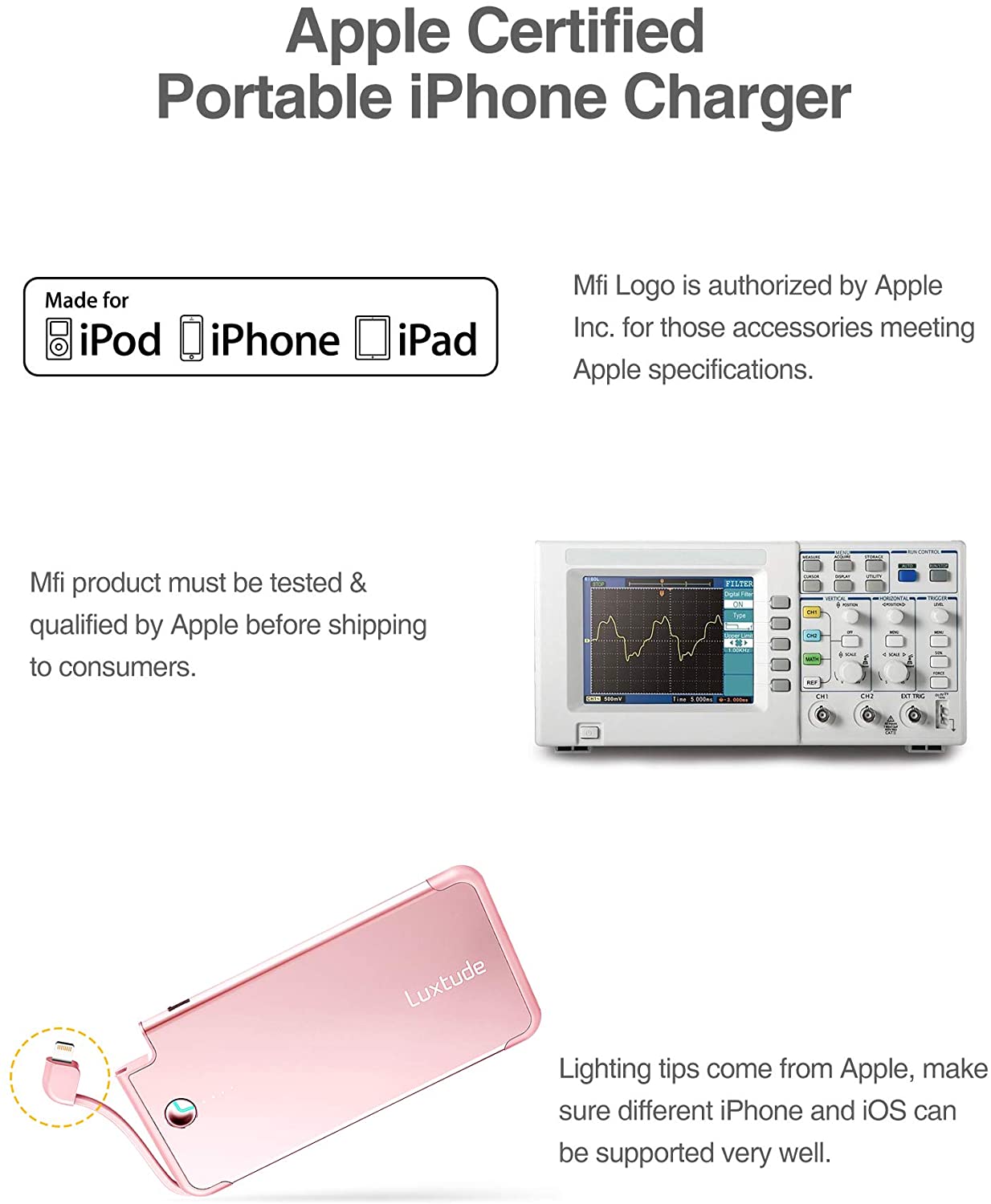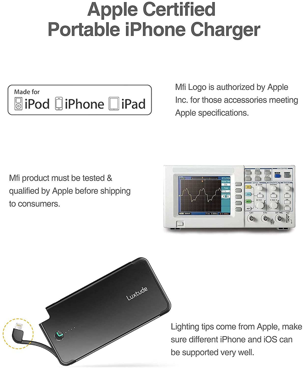 • ✔ SAFER PORTABLE PHONE CHARGER: Equipped with UL certified Li-Polymer battery pack as iPhone and qualified by Apple, it’s the iPhone portable charger to ensure safety all the time.